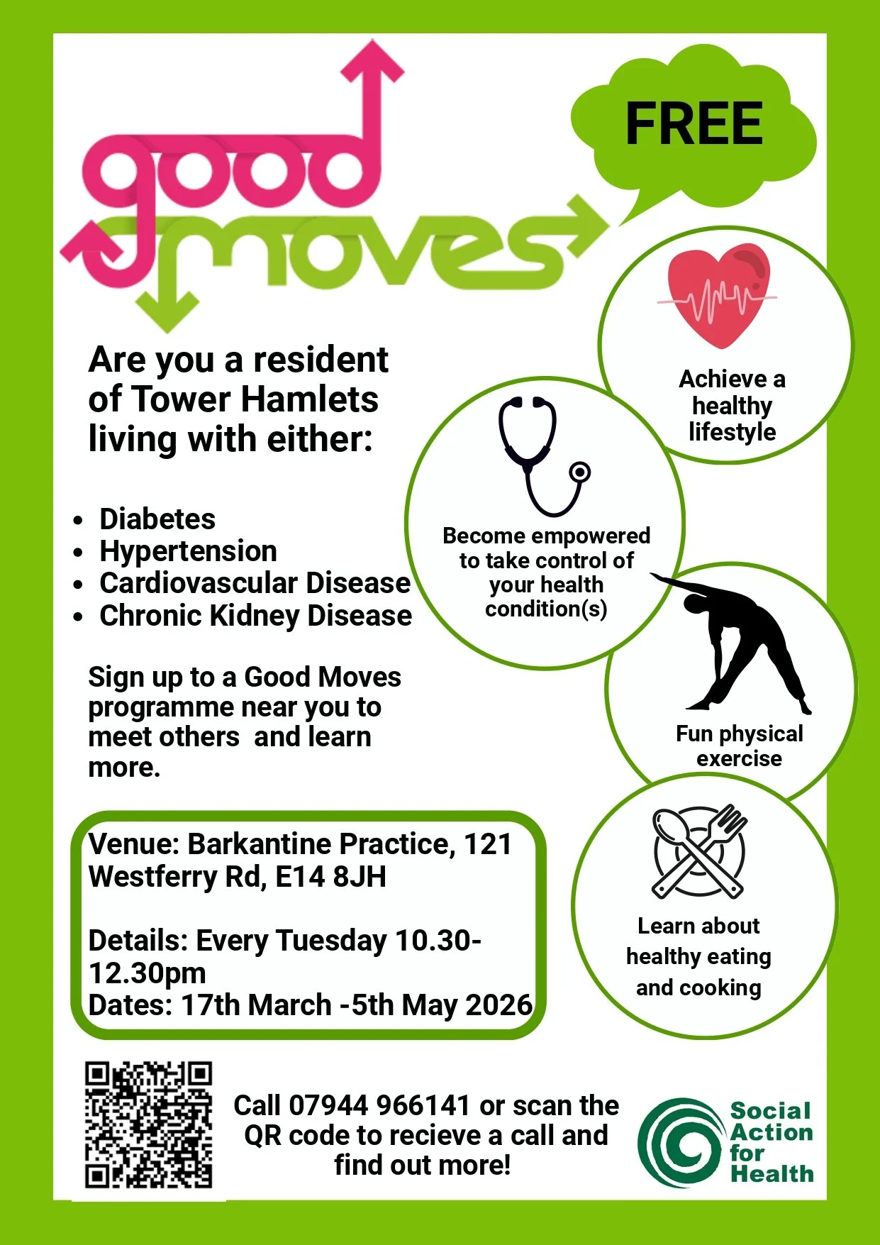 Free sessions for patients registered at Barkantine practice. Every Tuesday starting 17th March - 5th May 2026.