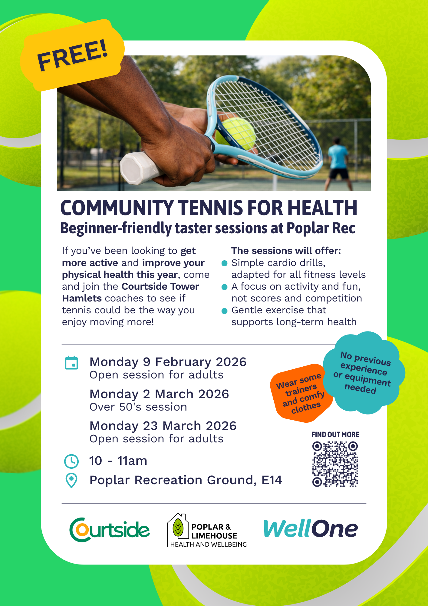 Free beginner-friendly tennis sessions at Poplar Recreation Ground